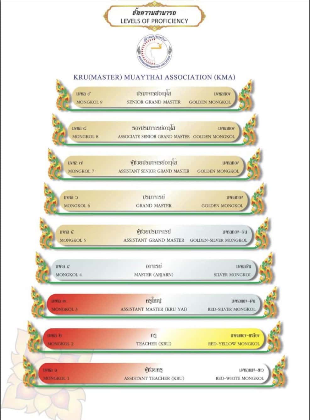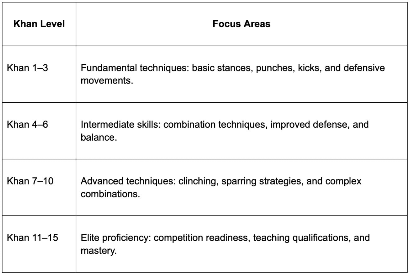 To provide structure, especially for youth and international students, the Khan Grading System was introduced. This system comprises multiple levels (commonly up to 15), starting from beginner ranks and culminating in prestigious titles such as Khru (Teacher) and Grandmaster.