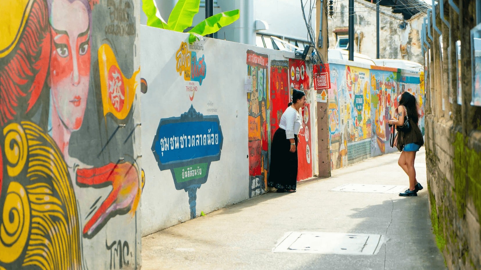 Charoen Krung Soi 36 is known for large-scale murals; this area has been transformed into an open-air art gallery with diverse artwork on walls and abandoned buildings.