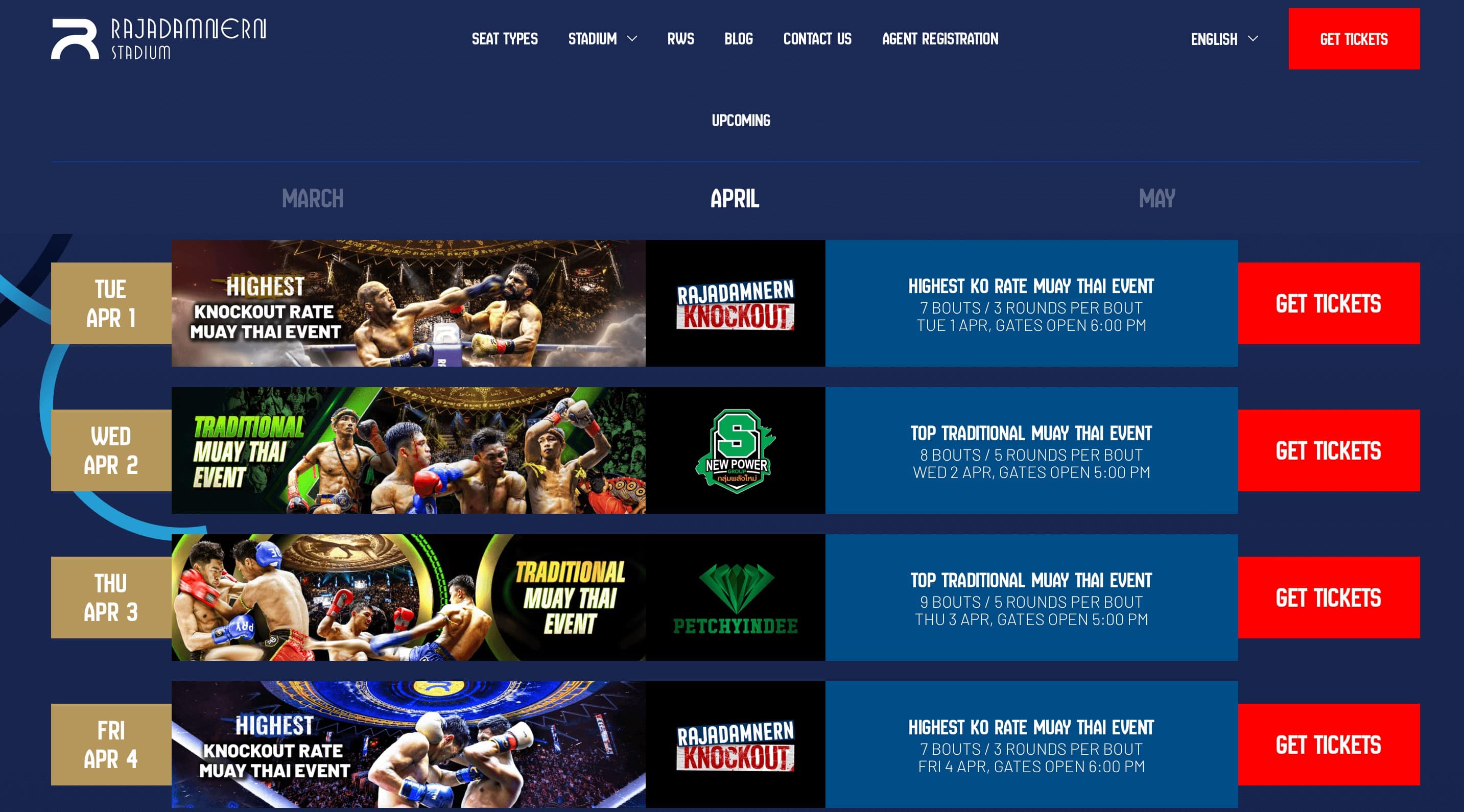 In addition to the regular schedule, Rajadamnern Stadium hosts special events and championship bouts. For the latest information on upcoming fights, visit the official Rajadamnern Stadium website.